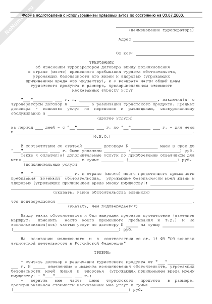 - 1458Требование туриста об изменении туроператором договора ввиду возникновения в стране (месте) временного пребывания туриста обстоятельств, угрожающих безопасности его жизни и здоровью (угрожающих причинением вреда его имуществу), и о возврате части общей цены туристского продукта в размере, пропорциональном стоимости неоказанных туристу услуг