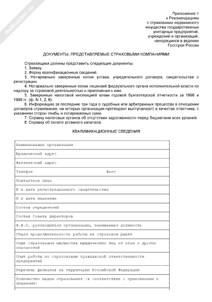 - 180Документы, представляемые страховыми компаниями при страховании объектов недвижимого имущества, находящегося в федеральной собственности и переданного в пользование федеральным государственным унитарным предприятиям, учреждениям и организациям, находящимся в ведении Госстроя России
