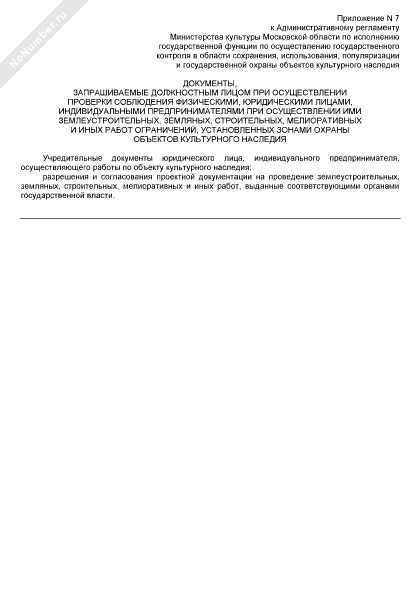 - 172Документы, запрашиваемые должностным лицом при осуществлении проверки соблюдения физическими, юридическими лицами, индивидуальными предпринимателями при осуществлении ими землеустроительных, земляных, строительных, мелиоративных и иных работ ограничений, установленных зонами охраны объектов культурного наследия Московской области