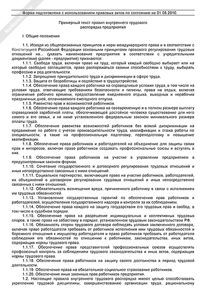 Примерный текст правил внутреннего трудового распорядка предприятия