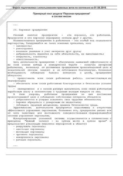 Примерный текст раздела «Персонал предприятия» в составе миссии