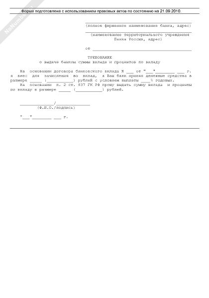 Требование о выдаче банком суммы вклада и процентов по вкладу