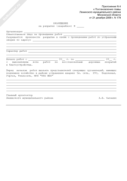 Разрешение на аварийные работы на территории Ленинского муниципального района Московской области (рекомендуемый образец заполнения)