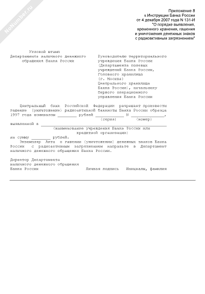 Разрешение на гашение или уничтожение денежных знаков Банка России с радиоактивным загрязнением (рекомендуемый образец заполнения)