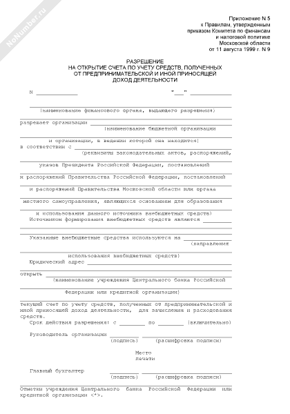 Разрешение на открытие счета по учету средств, полученных от предпринимательской и иной приносящей доход деятельности в Московской области (рекомендуемый образец заполнения)