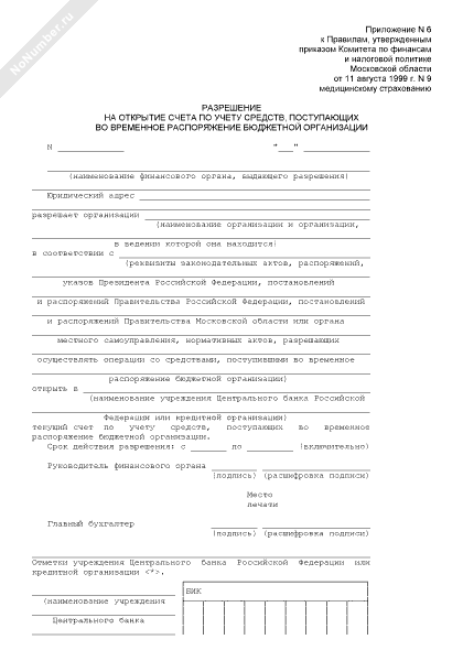 Разрешение на открытие счета по учету средств, поступающих во временное распоряжение бюджетной организации Московской области (рекомендуемый образец заполнения)