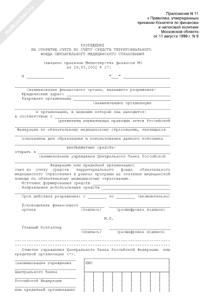 Разрешение на открытие счета по учету средств территориального фонда обязательного медицинского страхования Московской области (рекомендуемый образец заполнения)