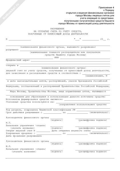Разрешение на открытие счета по учету средств, полученных от приносящей доход деятельности из бюджета города Москвы (рекомендуемый образец заполнения)