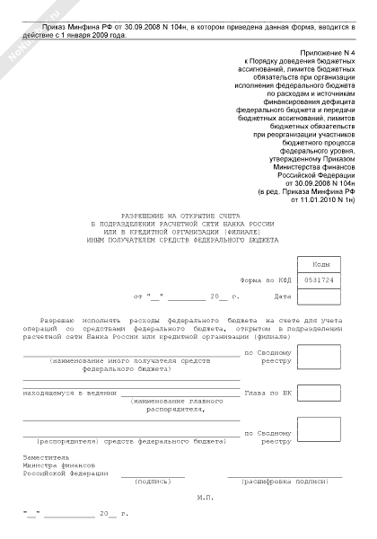 Разрешение на открытие счета в подразделении расчетной сети Банка России или в кредитной организации (филиале) иным получателем средств федерального бюджета