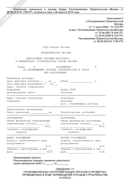 Разрешение на перемещение отходов строительства и сноса для захоронения в городе Москве (рекомендуемый образец заполнения)