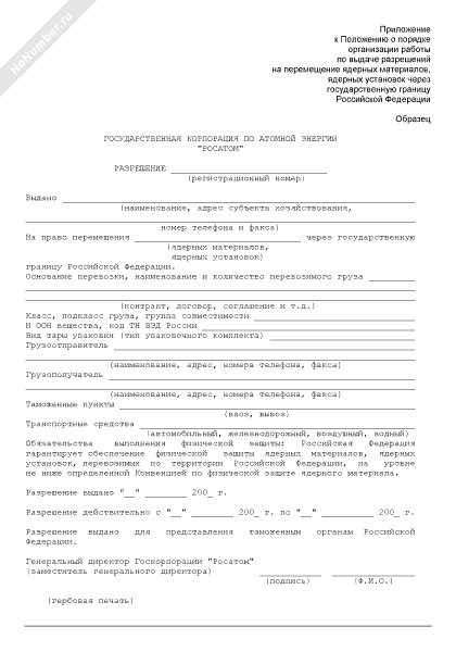 Разрешение на перемещение ядерных материалов, ядерных установок через государственную границу Российской Федерации (рекомендуемый образец заполнения)