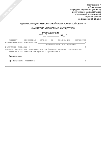 Разрешение на продажу имущества, находящегося на балансе предприятия Озерского района Московской области (рекомендуемый образец заполнения)