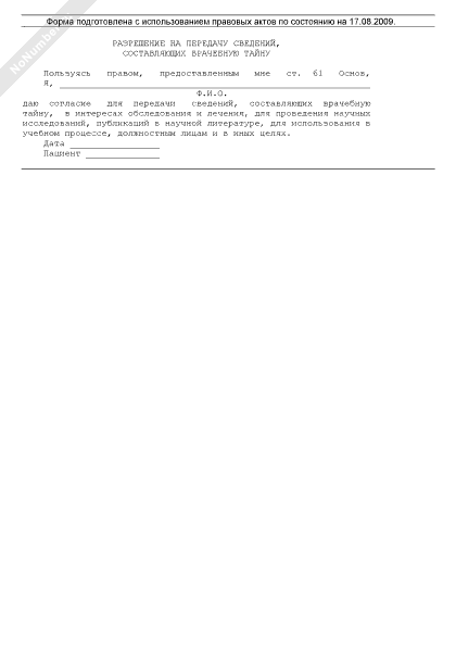 Разрешение на передачу сведений, составляющих врачебную тайну