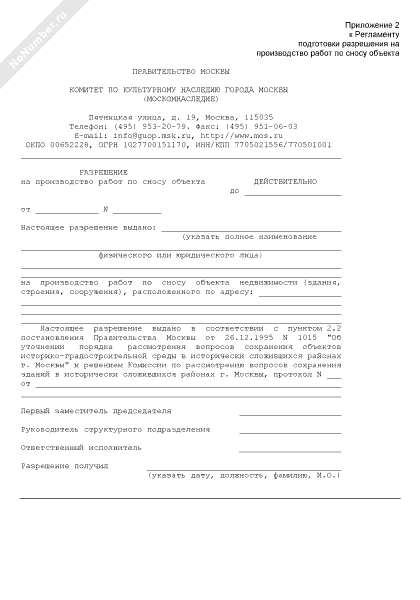 Разрешение на производство работ по сносу объекта города Москвы (рекомендуемый образец заполнения)