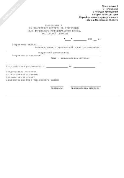 Разрешение на проведение лотереи на территории Наро-Фоминского муниципального района Московской области (рекомендуемый образец заполнения)