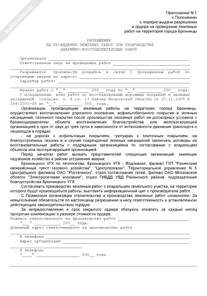 Разрешение на проведение земляных работ при производстве аварийно-восстановительных работ на территории города Бронницы Московской области (рекомендуемый образец заполнения)