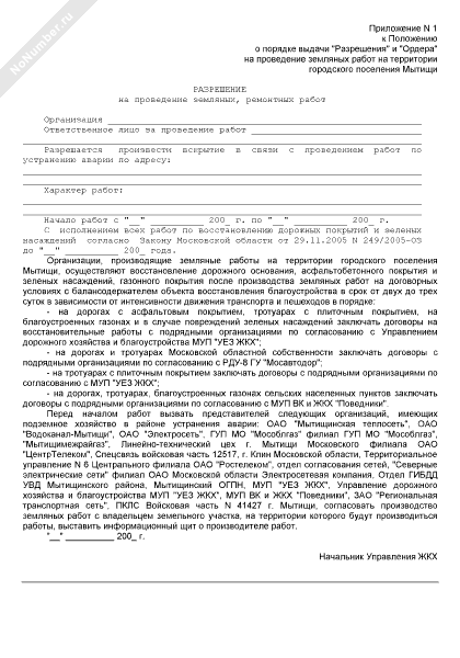 Разрешение на проведение земляных, ремонтных работ на территории городского поселения Мытищи Московской области (рекомендуемый образец заполнения)