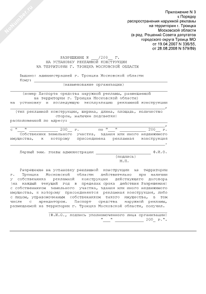 Разрешение на распространение наружной рекламы на территории г. Троицка Московской области (рекомендуемый образец заполнения)