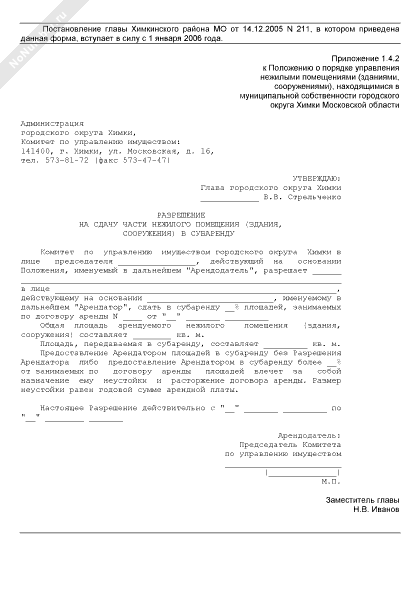 Разрешение на сдачу части нежилого помещения (здания, сооружения) муниципальной собственности городского округа Химки Московской области в субаренду (утверждается главой городского округа Химки)