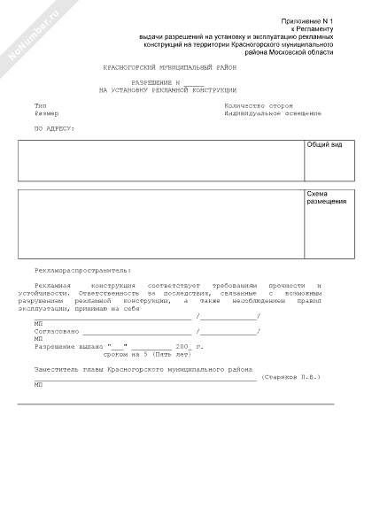 Разрешение на установку рекламной конструкции на территории Красногорского муниципального района Московской области (рекомендуемый образец заполнения)