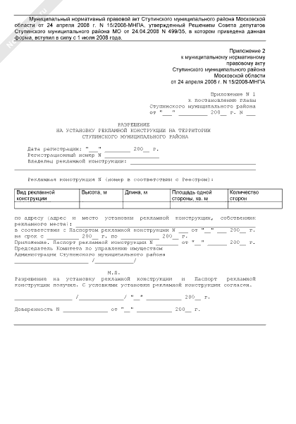 Разрешение на установку рекламной конструкции на территории Ступинского муниципального района Московской области (рекомендуемый образец заполнения)