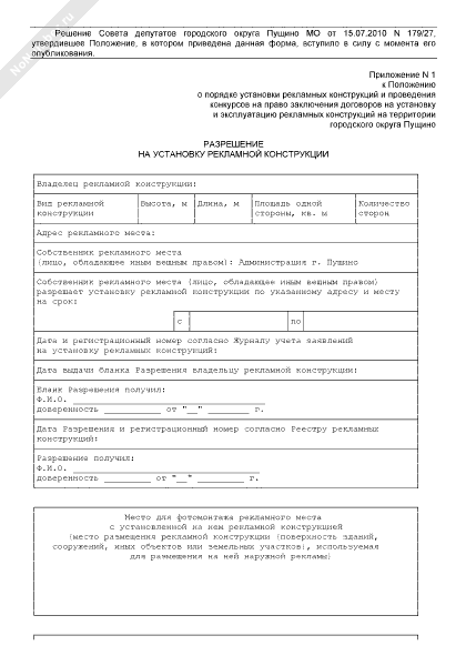 Разрешение на установку рекламной конструкции на территории городского округа Пущино Московской области (рекомендуемый образец заполнения)