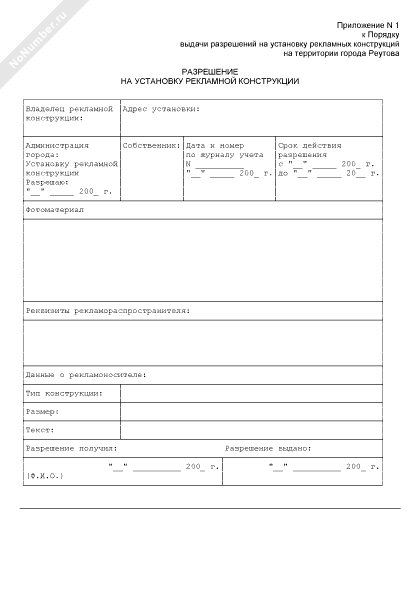 Разрешение на установку рекламной конструкции на территории города Реутова Московской области (рекомендуемый образец заполнения)