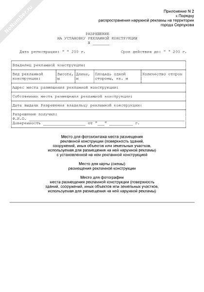 Разрешение на установку рекламной конструкции на территории города Серпухова Московской области (рекомендуемый образец заполнения)