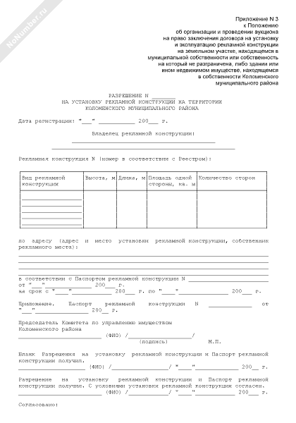 Разрешение на установку рекламной конструкции на территории Коломенского муниципального района Московской области (рекомендуемый образец заполнения)