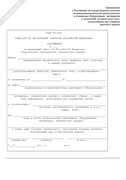 Разрешение на временный вывоз из Российской Федерации оборудования (материалов, технических данных), которое может быть использовано при создании ракетного оружия