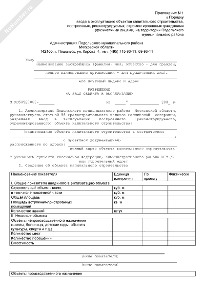 Разрешение на ввод объекта в эксплуатацию на территории Подольского муниципального района Московской области (рекомендуемый образец заполнения)