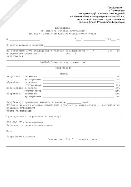 Разрешение на вырубку зеленых насаждений на территории Клинского муниципального района Московской области (рекомендуемый образец заполнения)