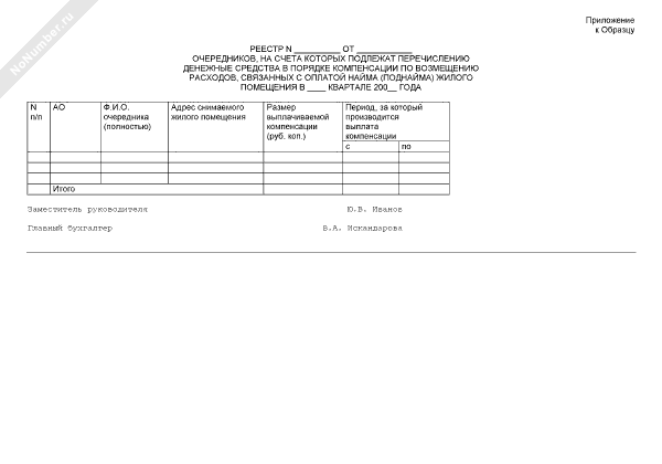 - 293Реестр очередников, на счета которых подлежат перечислению денежные средства в порядке компенсации по возмещению расходов, связанных с оплатой найма (поднайма) жилого помещения (приложение к образцу распоряжения Департамента жилищной политики и жилищного фонда города Москвы о выплате компенсации по возмещению расходов, связанных с оплатой найма (поднайма) жилого помещения)