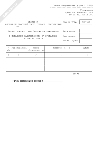 - 294Реестр очередных платежей через Госбанк в погашение задолженности за проданные в кредит товары. Специализированная форма № 7-ТКр