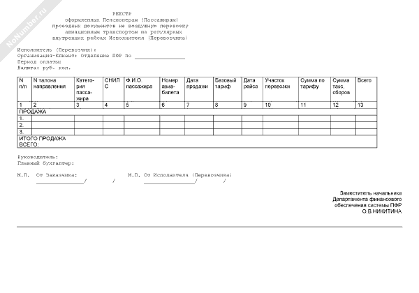 - 292Реестр оформленных пенсионерам (пассажирам) проездных документов на воздушную перевозку авиационным транспортом на регулярных внутренних рейсах исполнителя (перевозчика) (приложение к договору на перевозку пенсионеров, являющихся получателями трудовых пенсий по старости и по инвалидности, проживающих в районах Крайнего Севера и приравненных к ним местностях, к месту отдыха на территории Российской Федерации и обратно авиационным транспортом на внутренних авиалиниях)