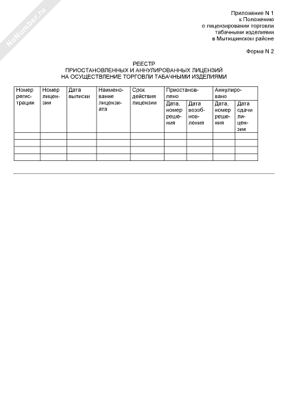 - 382Реестр приостановленных и аннулированных лицензий на осуществление торговли табачными изделиями (приложение к положению о лицензировании торговли табачными изделиями в Мытищинском районе) (форма № 2)