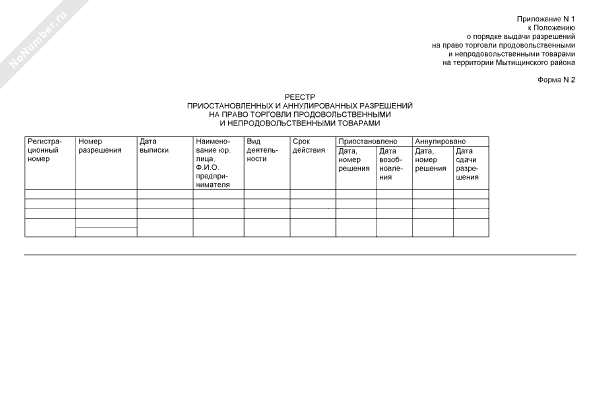 - 383Реестр приостановленных и аннулированных разрешений на право торговли продовольственными и непродовольственными товарами (приложение к положению о порядке выдачи разрешений на право торговли продовольственными и непродовольственными товарами на территории Мытищинского района) (форма № 2)