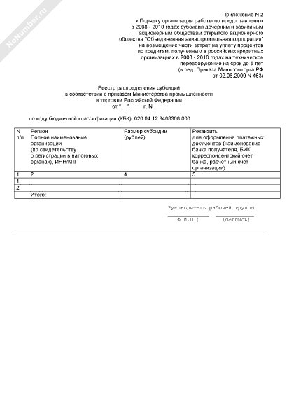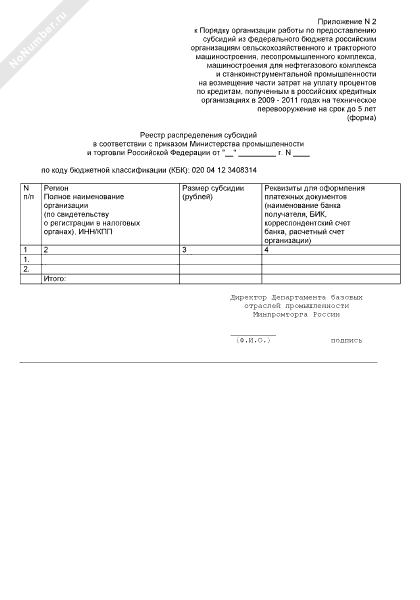 - 400Реестр распределения субсидий из федерального бюджета российским организациям сельскохозяйственного и тракторного машиностроения, лесопромышленного комплекса, машиностроения для нефтегазового комплекса и станкоинструментальной промышленности на возмещение части затрат на уплату процентов по кредитам, полученным в российских кредитных организациях в 2009–2011 годах на техническое перевооружение на срок до 5 лет, в соответствии с приказом Министерства промышленности и торговли Российской Федерации