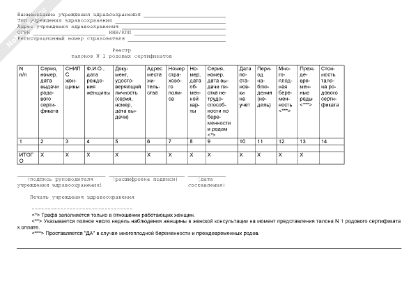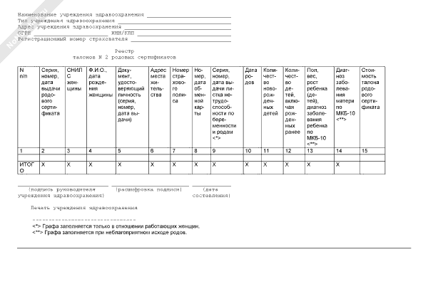 - 506Реестр талонов № 2 родовых сертификатов, предназначенных для оплаты услуг по медицинской помощи учреждениям здравоохранения, оказывающим медицинскую помощь женщинам в период родов и в послеродовой период в родильных домах (отделениях), перинатальных центрах