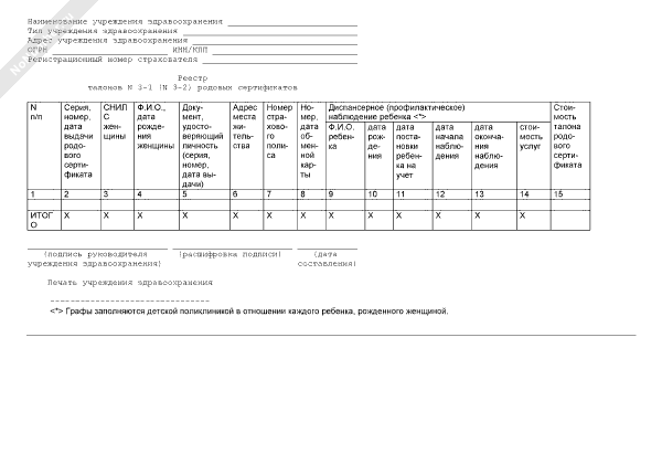 - 507Реестр талонов № 3-1 (N 3-2) родовых сертификатов, предназначенных для оплаты услуг по медицинской помощи учреждениям здравоохранения, осуществляющим диспансерное (профилактическое) наблюдение детей за первые шесть месяцев диспансерного (профилактического) наблюдения детей, поставленных в течение первого года жизни в возрасте до 3 месяцев на диспансерный учет (для оплаты услуг по медицинской помощи детским поликлиникам за вторые шесть месяцев диспансерного (профилактического) наблюдения детей)