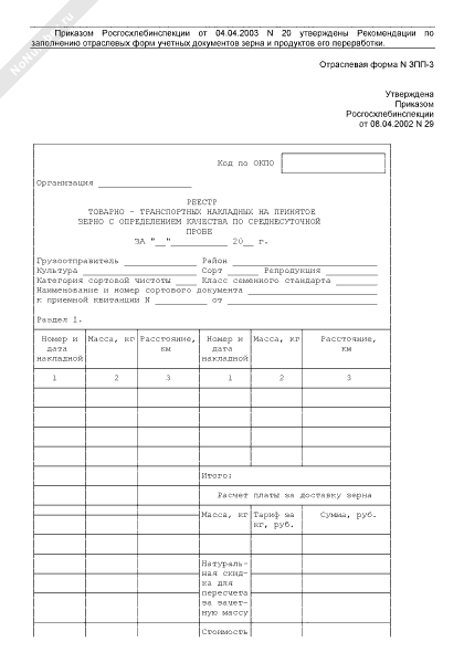 - 512Реестр товарно-транспортных накладных на принятое зерно с определением качества по среднесуточной пробе. Отраслевая форма № ЗПП-3