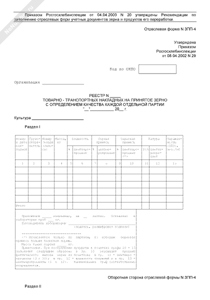 - 511Реестр товарно-транспортных накладных на принятое зерно с определением качества каждой отдельной партии. Отраслевая форма № ЗПП-4