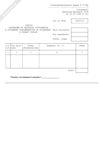 - 518Реестр удержаний из зарплаты сотрудников в погашение задолженности за проданные в кредит товары. Специализированная форма № 4-ТКр