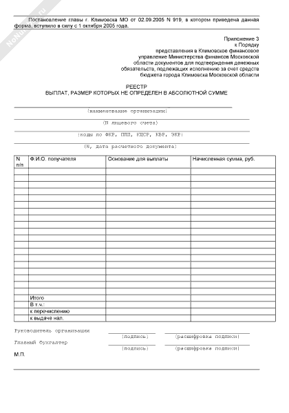 - 94Реестр выплат, размер которых не определен в абсолютной сумме для подтверждения денежных обязательств, подлежащих исполнению за счет средств бюджета города Климовска Московской области