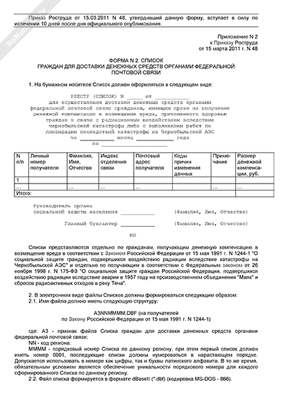 Реестр (список) для осуществления доставки денежных средств органами федеральной почтовой связи гражданам, имеющим право на получение денежной компенсации в возмещение вреда, причиненного здоровью граждан в связи с радиационным воздействием вследствие чернобыльской катастрофы либо с выполнением работ по ликвидации последствий катастрофы на Чернобыльской АЭС (форма № 2)