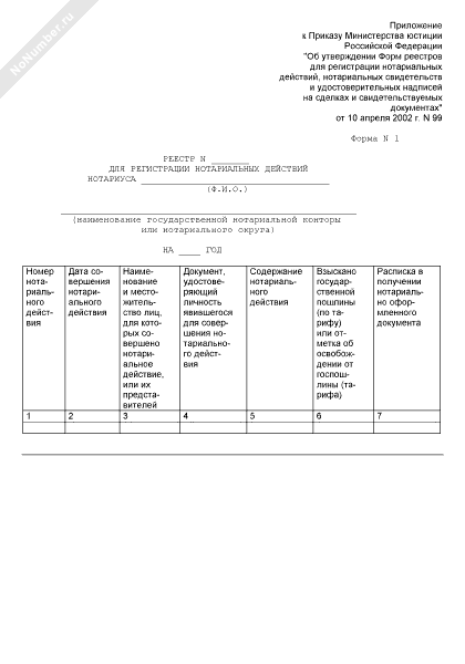 Реестр для регистрации нотариальных действий нотариуса (форма № 1)