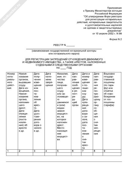 Реестр для регистрации запрещений отчуждения движимого и недвижимого имущества, а также арестов, наложенных судебными и следственными органами (форма № 2)