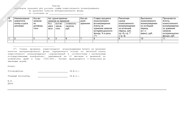 Реестр договоров хранения для расчета суммы комиссионного вознаграждения за хранение запасов интервенционного фонда (приложение к справке-расчету о причитающемся агенту комиссионном вознаграждении за организацию хранения запасов интервенционного фонда продовольственного зерна)
