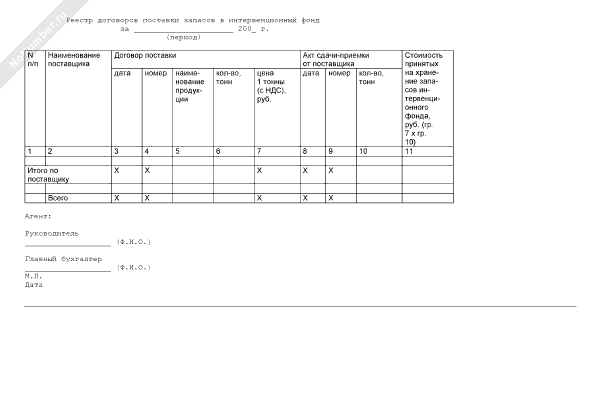 Реестр договоров поставки запасов в интервенционный фонд (приложение к справке-расчету о причитающемся агенту комиссионном вознаграждении за проведение закупочных интервенций продовольственного зерна)