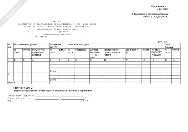 Реестр документов, представляемых для возмещения в 2009 году части затрат на уплату процентов по кредиту (приложение к договору о предоставлении бюджетной субсидии на возмещение части затрат на уплату процентов по обеспечению продовольственной безопасности города Москвы)